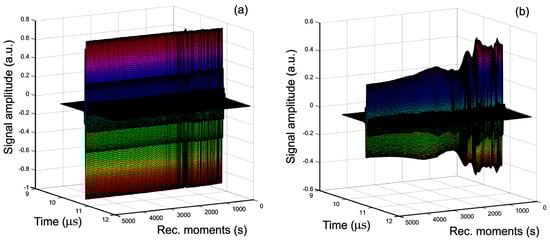 Figure 1 shows the superposition of the 1000 signals that were recorded for the two analyzed samples of CrHAp and CrHApAx. All these signals, covering 5000 s of process evolution, are represented as water flow from right to left. Figure 1a shows that in the case of the CrHAp sample, the sedimentation process is uniform. The small variations in the total amplitude of the signal each last a few tens of seconds. In the case of the CrHApAx sample, it is observed that the sedimentation process is irregular. Large variations in the amplitude of the signals, which last minutes, are observed (Figure 1b).
