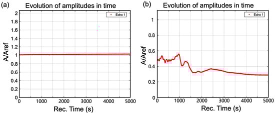 In Figure 2a, a slow and continuous increase of the signal amplitude is observed for the CrHAp sample. A small amplitude decrease recorded at t = 1300 s was attributed to the formation of a particle cluster. In the case of the CrHApAx sample, a rapid variation during 1000 s is observed, followed by a period of slower but ample variation of amplitude with a general decreasing trend (Figure 2b). This evolution of the CrHApAx suspension is associated with the formation of nanoparticle clusters, followed by a rapid temporal variation of the suspension properties. After 2500 s, the evolution is a continuous progressive reduction in amplitude.