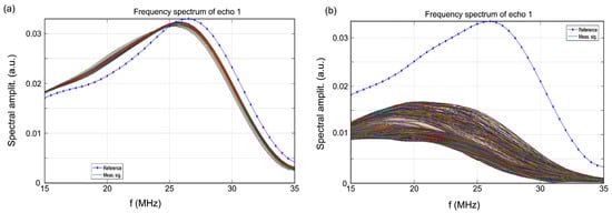 The evolution of the frequency spectra for each of the 1000 signals for the two analyzed samples (CrHAp and CrHApAx) is presented in Figure 3. For comparison, the spectrum of the reference liquid (double-distilled water, in dotted blue line) is also represented in Figure 3. It can be noted that in the case of the CrHAp sample, the spectra are very closely packed, indicating a constant composition of the suspension (Figure 3a). The peaks are located at 25.5 MHz. This value is slightly below the 26.2 MHz peak corresponding to the reference liquid. The lack of overlap is due to the attenuation of the ultrasonic signal. In the case of the CrHApAx sample (Figure 3b), it can be noted that the spectra are relatively evenly spread during the monitoring process. The amplitudes are considerably lower than in the reference liquid, indicating a stronger attenuation of the ultrasonic signals.