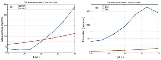 The temporal evolution of signals’ frequency spectra, which is related to the properties of the CrHAp and CrHApAx suspension in front of the transducers, bring more insight to the attenuation process. The time-averaged attenuation plot for both samples is shown in Figure 4. Compared against the standard attenuation in the reference liquid (red dotted line) the attenuation is larger for the CrHAp sample in the higher frequency ranges, reaching 74 nepper/m at 35 MHz (Figure 4a). Moreover, Figure 4a revealed that in the frequency range 15–25.5 MHz, the attenuation is lower than the attenuation in the reference liquid and is even negative for frequencies below 22.5 MHz. The attenuation is obtained by signal comparison with that of the reference liquid. Since the signal propagates with higher amplitude between the transducers compared to the signal in the reference liquid in the same experimental conditions, the determined attenuation is negative. This result indicates the presence of nanoparticles with higher elastic compressibility factor, like in metals for example. The time-averaged attenuation plot for the CrHApAx sample is shown on Figure 4b. Compared against the standard attenuation in the reference liquid (red dotted line), the attenuation is larger for the CrHApAx sample, and this is verified for all analyzed frequencies. There is a specific peak attenuation at 32 MHz, indicating a resonance of the nanoparticles in suspension.