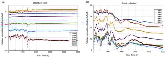 Another characteristic of the CrHAp and CrHApAx suspensions is their spectral stability, which represents the amplitude of the frequency component of each spectrum as a function of time (Figure 5). In the case of the CrHApAx sample (Figure 5b), it can be observed that during 1500 s, the irregular sedimentation produces a series of ripples for each selected frequency. A slower evolution is recorded up to t = 3500 s, being almost monotonic for lower frequencies (15–18 MHz), but with marked peaks for higher frequencies. The higher the frequency, the later the peak appears in the spectrum, indicating a progressive change in the suspension concentration. After 3500 s, the suspension exhibits a monotonic slowly decreasing amplitude, attributed to the higher attenuation of the smallest nanoparticles remaining in the suspension (Figure 5b).