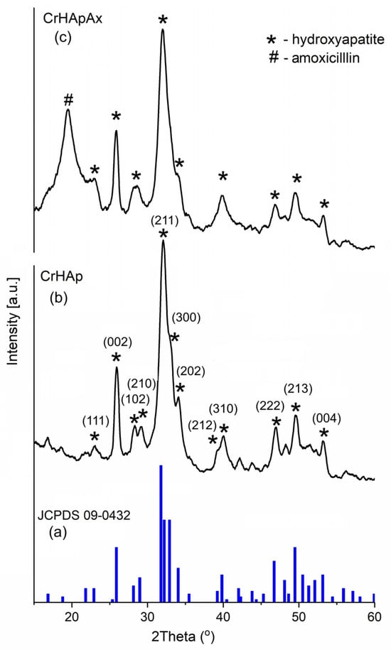On the other hand, in accordance with Bragg’s law [44], the observed peaks were slightly shifted to smaller angles for the CrHAp sample. Furthermore, with amoxicillin-doped CrHAp, a slight broadening of the peaks and a decrease in their intensity was observed. The presence of the peak at 2θ = 19.589 specific to amoxicillin was observed in the CrHApAx sample. This broadening of the peaks observed in the CrHApAx sample could be caused by both crystallization imperfections and the incorporation of amoxicillin during the synthesis process.