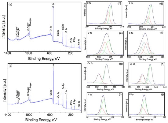 Full XPS spectra of CrHAp (a) and CrHApAx (b) samples. High-resolution XPS spectra of C 1s for CrHAp (c) and CrHApAx (d) samples. High-resolution XPS spectra of O 1s for CrHAp (e) and CrHApAx (f) samples. High-resolution XPS spectra of Ca 2p for CrHAp (g) and CrHApAx (h) samples. High-resolution XPS spectra of P 2p for CrHAp (i) and CrHApAx (j) samples.