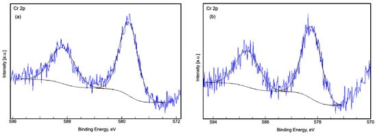 The high-resolution XPS spectrum of Cr2p for the CrHAp and CrHApAx samples was fitted with the specific doublet 2p3/2 and 2p1/2 spaced at approximately 9.6 eV and with an area ratio close to 2:1 (Figure 8).