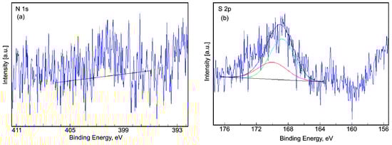The high-resolution spectra of N1s and S 2p for the CrHApAx sample are shown in Figure 9. As can be seen in Figure 9a, nitrogen is very weak. On the other hand, the high-resolution XPS spectrum of S 2p after deconvolution showed two components located at BE of 168.79 and 169.99 eV. S2p overlaps a loss of P2p. Its binding energy is specific to sulfates.