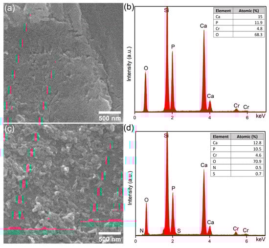 The presence of the N and S in the EDS spectra characteristic for the CrHApAx underlines the presence of the Ax in the layer. In addition, in Figure 10d, the line that belongs to Ca, P, Cr, and O from the CrHAp composition can be seen. The Si line appears due to the substrate on which the layers are deposited. The purity of the CrHAp and CrHApAx layers is proven by the absence of the additional lines in both EDS spectra.