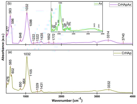 FTIR general spectra obtained for CrHAp (a) and CrHApAx (b). In the inset, the FTIR general spectra of Ax are presented.