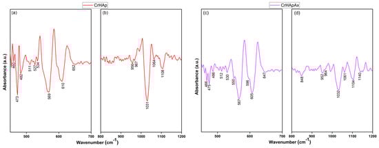 Valuable data regarding the subtle spectral changes resulting from the addition of Ax to the CrHAp were assessed by performing second derivative analysis of the FTIR spectra in the regions of 450–700 cm−1 (where the vibration specific to ν2 and ν4 of the phosphate groups appears) and 900–1200 cm−1 (this region is characteristic to ν1 and ν3 vibration of the phosphate groups). The results of second derivative analysis are presented in Figure 12a,b (for the CrHAp) and in Figure 12c,d (for the CrHApAx).