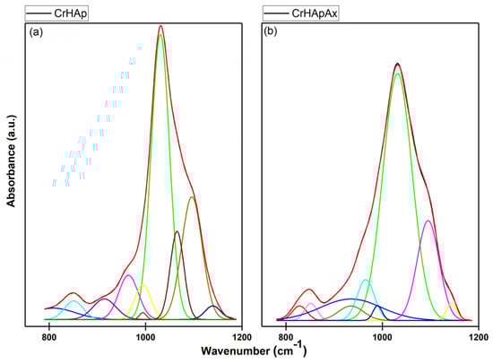 Deconvoluted FTIR spectra of the CrHAp and CrHApAx obtained in the 800–1200 cm−1 spectral region.