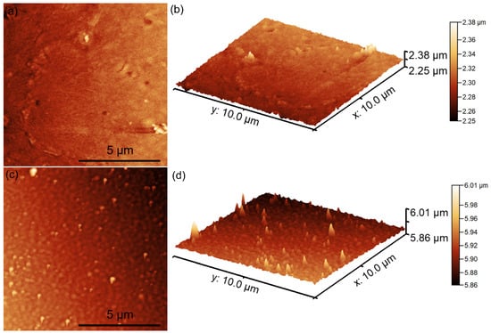 2D topography of the CrHAp (a) and CrHApAx (c) coatings’ surface recorded on an area of 10 × 10 µm2 and their 3D representations (b,d).