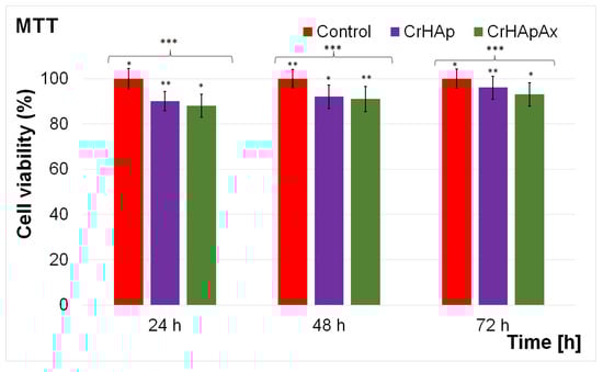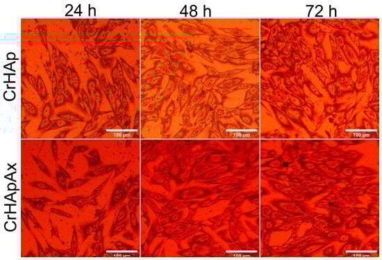 The cell viability of MG63 cells incubated with CrHAp and CrHApAx coatings was measured after 24, 48, and 72 h and expressed as mean ± standard deviation (SD) relative to a control (100% viability). The results are presented in Figure 15. The results of the MTT assay revealed that both CrHAp and CrHApAx coatings demonstrated good biocompatibility towards MG63 cells. The cell viability determined for CrHAp coatings exceeded 90% for all tested intervals. The results showed a notable increase in cell viability to 92% and 96% after 48 and 72 h, respectively, indicating that they could be considered a good surface for the proliferation of MG63 cells. The results of the MTT studies for the CrHApAx coatings also showed good biocompatibility, having a cell viability above 88% across all the tested intervals, meeting ISO 10993–1:2018 standards. As defined by the ISO 10993–1: 2018 standard [49,50,51], the biocompatibility of a material refers to its ability to have an appropriate host response for a specific application. A cell viability rate above 88% is regarded as biocompatible, indicating a strong compatibility with living cells, tissues, or organisms. In this context, the cell viability represents the percentage of cells that remain alive and functional after exposure to the tested material. A value above 88% suggests the material does not exhibit significant cytotoxic effects, such as damaging cells or inducing apoptosis. High viability rates above 88% also imply that the material does not provoke adverse biological responses, including inflammation, toxicity, or immune rejection. These factors are critical in determining whether a material can be safely integrated and perform effectively within a biological system. More than that, a slight increase in cell viability was observed over time, reaching 93% after 72 h of incubation, which indicates a sustained compatibility with MG63 cells. The results of the MTT assays highlighted that the presence of Ax (amoxicillin) in CrHAp did not significantly impact cell viability, suggesting its potential for combining antibacterial and osteo-regenerative properties in biomedical applications.