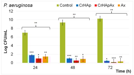 The results of the in vitro antibacterial activity revealed the ability of CrHAp, Ax, and CrHApAx coatings to reduce P. aeruginosa CFU counts, highlighting their significant potential as antibacterial agents for infection control in healthcare. In addition, CrHAp provide an intrinsic antibacterial activity attributed to the presence of chromium ions, while Ax exhibits direct antibacterial effects due to the antibiotic’s ability to interfere with the bacterial cell wall synthesis. The comparative antibacterial studies showed that CrHApAx coatings demonstrate the greatest CFU reduction, followed by Ax and CrHAp individually.