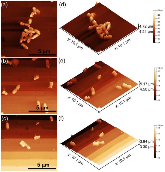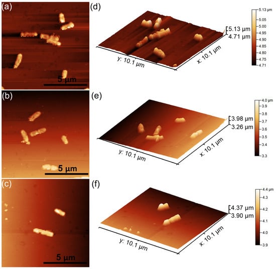 Two-dimensional AFM topography of Pseudomonas aeruginosa 27853 ATCC cells attached to the surface of the CrHApAx coatings after a 24 (a), 48 (b), and 72 h (c) incubation period and their 3D representation (d–f).