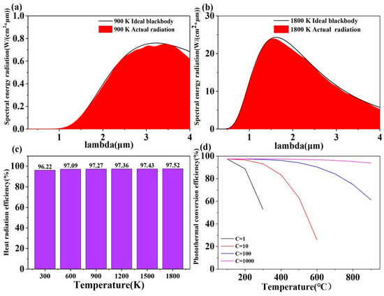 (a) The black radiation diagram at 900 K. (b) The black radiation diagram at 1800 K. (c) The efficiency of thermal radiation for the structure at various temperatures. (d) The curve diagram illustrates the pc efficiency of the absorber under different solar concentration coefficients and temperatures.