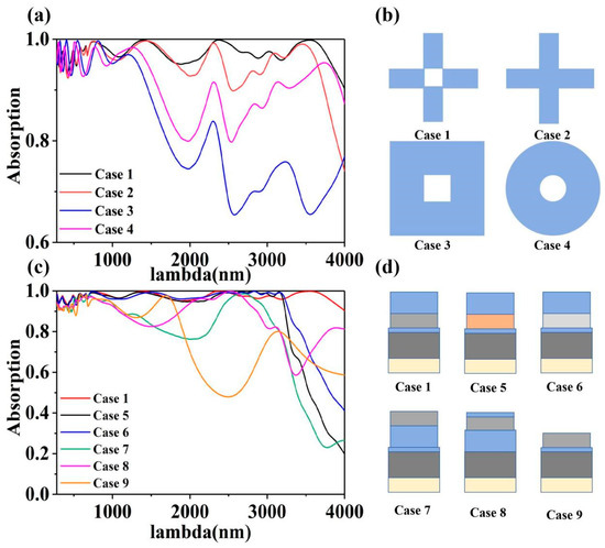 (a) is the absorption efficiency plot of the four different structures changing the upper overall frame; (b) is the top view corresponding to the four structures shown in (a); (c) is the absorption efficiency plot of the six different structures of the materials used and changed; (d) is the side view of the six structures corresponding to (c).