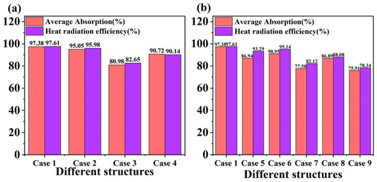 Figure 5a corresponds to the structure changed in Figure 4b and Figure 5b corresponds to the structure changed in Figure 4d. The pink column in Figure 5 indicates the average absorption efficiency of each structure at wavelengths 280–4000 nm, and the purple column indicates the thermal radiation efficiency of each structure at 2100 K. Our chosen Ti-TiO2-Ti cross structure has a unique symmetry and geometrical configuration that helps to realize the cavity coupling effect. When the frequency of the incident light matches the resonance frequency of the cross structure, a strong electric field resonance forms inside the structure, thus enhancing the light absorption and capture efficiency [56]. At the gap and intersection of the cross structure, regions of high electric field strength are formed due to the superposition effect of the electric field. These regions can significantly enhance light-matter interactions and enhance light absorption [57]. The cross structure can effectively capture the incident light and restrict it to the structure for multiple reflections and refractions, thus increasing the interaction time between light and matter and improving the absorption efficiency of light. Under the action of the cavity coupling effect, light can be transmitted and transmitted inside the cross structure, further promoting the absorption and utilization of light. In the cross structure, we chose the cross structure with Ti-TiO2-Ti with high heat resistance. When the frequency of the incident light matches the frequency of the free electron oscillation in the metal material, the local surface plasmon resonance (LSPR) effect is generated on the metal material surface, namely the surface plasmon resonance [58,59]. The LSPR effect can produce a strong electromagnetic field enhancement on the surface of metallic materials, namely “hot spots”. These hot spots can significantly increase the interaction strength of light and matter, thus enhancing the absorption efficiency of light. In the Ti-TiO2-Ti cross structure, the LSPR effect and the cavity coupling effect can work together to enhance the absorption efficiency of light. The near-field enhancement produced by the LSPR effect can be further superimposed with the electric field resonance generated by the cavity coupling effect to form a stronger electric field enhancement [60]. Through the overall comparison, it can be observed that the selected structure of the average absorption efficiency and thermal radiation efficiency is higher than several other structures; the only one with the same is case 2, but as shown in Figure 4a, case 2 bandwidth is not so long as our structure, so comprehensive case 1 is the most suitable of the nine structure.