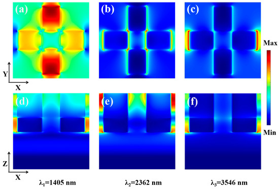The electric field strength is also a key factor affecting the absorption efficiency. At the same material and frequency, the higher the electric field strength, the higher the absorption efficiency of the electromagnetic wave [61]. Figure 6a–c shows that at a wavelength of 1405 nm, the electric field is predominantly located on the surface of the TiO2 and along the edges of the cross structure. As the wavelength increases, TiO2 surfaces no longer have such a high electric field, and it is evenly distributed near the short edge of the cross structure, which is because of the excitation of LSPR at the resonance wavelength [62]. For further investigation, Figure 6d–f depicts the distribution of the electric field within the xoz plane. It is evident from Figure 6d–f that the electric field is higher in both the Ti layer and the TiO2 layer, and in Figure 6e, it is more intensely focused within the TiO2 layer. The electric field distribution observed here suggests the occurrence of the LSPR. Therefore, LSPR is the main reason for the longer absorption bandwidth of this absorber. The characteristics of the electric field distribution indicate that metal/dielectric stacked structures of different widths are excited into multiple surface isonic resonant modes under irradiation of incident light, thus allowing the structure to form a flat high absorption curve [63].