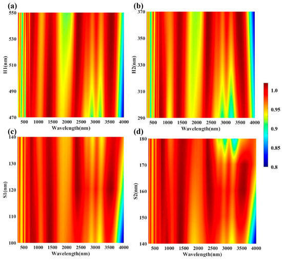 Figure 8a illustrates the impact of varying thickness H1 on the absorption efficiency. As it is evident from Figure 8a, changes in thickness H1 up to approximately 800 nm have minimal influence on the absorption efficiency. Beyond 800 nm, the absorption efficiency increases with greater thickness H1 until around 1500 nm, after which it decreases as thickness H1 continues to increase. After exceeding 2500 nm, the absorption efficiency rises again with increasing thickness H1. Overall, more bands are enhanced by increased thickness H1 than are diminished, suggesting that a thicker structure may be beneficial. However, maintaining an overall average absorption efficiency is crucial. The intermediate value of 510 nm was also selected as the ultimate outcome. Figure 8b illustrates the effect of the variation in thickness H2 on the absorption efficiency. As it is evident from Figure 8b, the change in thickness H2 before 800 nm has no obvious influence on the absorption efficiency; 800–1000 nm absorption decreases with increasing thickness H2, 1000–1500 nm with increasing thickness H2, 1500–2500 nm again decreased with increasing thickness H2, 2500–3500 nm increased with increasing thickness H2, and 3500–4000 nm again decreased with increasing thickness H2. The increased band and the decreased band are generally poor. To balance the overall absorption efficiency of each wavelength. The median value of 330 nm was selected as the ultimate outcome. Figure 8c illustrates the influence of the change in the short side length S1 on the absorption efficiency, which has no obvious change before 2000 nm. Different from the thickness change, the band from 2500 nm to 3000 nm decreases from the middle length of 120 nm. In total, the absorption efficiency of the middle length 120 nm is generally higher than other lengths, so we chose 120 nm as the ultimate outcome. Figure 8d illustrates the effect of the change in the long side length S2 on the absorption efficiency. It is evident from Figure 8d that the middle length of 160 nm is approximately higher than 95%, and due to the influence of the process, more than this value is difficult to make, so we choose 160 nm as the ultimate outcome.