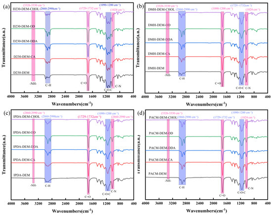 (a) FTIR spectra of D230-DEM and modified D230-DEM. (b) FTIR spectra of DMH-DEM and modified DMH-DEM. (c) FTIR spectra of IPDA-DEM and modified IPDA-DEM. (d) FTIR spectra of PACM-DEM and modified PACM-DEM.