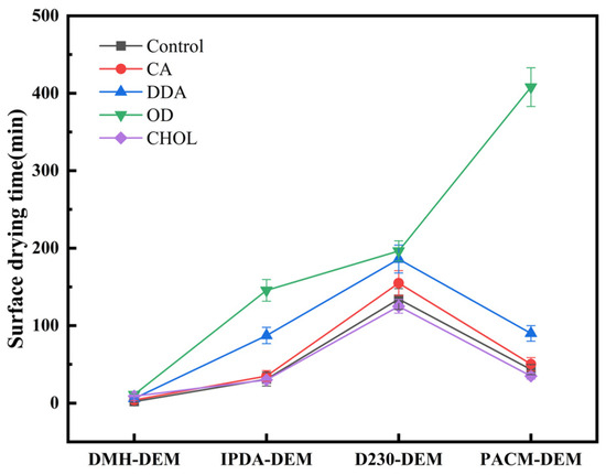 The surface-drying time of the modified PAEs varies, enabling tailored selection based on specific process requirements. Polyurea coatings were prepared using PAEs with different branching structures and molecular weights as starting materials, following the method in Section 2.4. The surface-drying time was observed and recorded, with results presented in Figure 2. Overall, the surface-drying time of PAEs increased after ester exchange modification. The D230-DEM series exhibited relatively long surface-drying times due to the presence of long chains in the D230 molecular structure. These long chains increased steric hindrance around the secondary amine group and enhanced the internal plasticization effect, reducing the reaction activity. The PACM-DEM series exhibited the longest surface-drying time after modification with OD, showing a more pronounced effect compared to other monohydric alcohol modifications. The steric hindrance from the cyclic structures in PACM and the grafted OD extended the surface-drying time to as long as 408 min, which is significantly slower than the fast-reacting traditional polyurea (5–10 s). The surface-drying time of the IPDA-DEM series showed only minor variations but reached its maximum after modification with OD. The DMH-DEM series exhibited the shortest surface-drying time, with little variation, remaining close to the control group. The shorter molecular chains in DMH had minimal impact on the original steric hindrance, resulting in the fastest reaction rate.