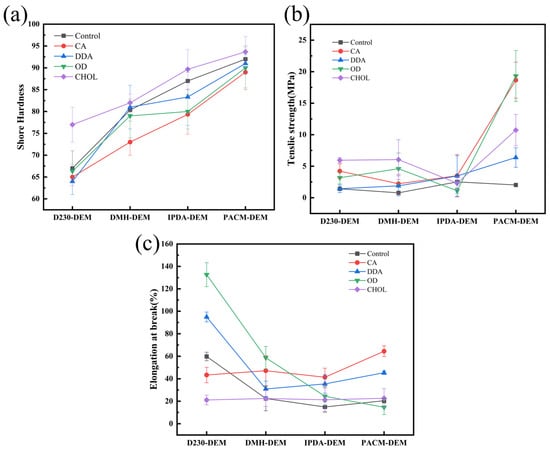 PAEs derived from different diamines exhibit varying reactivity and significant differences in the mechanical properties of the resulting polyurea, directly influencing flexibility, hardness, tensile strength, and elongation at break. Figure 3a presents the Shore A hardness test results of the PAE-PUA coatings. Overall, the hardness progressively increases from the D230-DEM series to the PACM-DEM series. The D230-DEM series exhibited relatively low hardness due to the internal plasticizing effect of its long molecular chains, which reduced crosslinking density and increased flexibility. After the introduction of cyclohexanol, a rigid group, the hardness increased due to its contribution to a denser crosslinked structure. The rigid cycloaliphatic structure of the IPDA-DEM series enhances crosslinking density and restricts chain mobility, leading to increased hardness. In contrast, the PACM-DEM series exhibited significantly higher hardness than other samples, peaking after modification with cyclohexanol. This increase is attributed to the cyclic structure in PACM, which promotes the formation of a denser crosslinked network. However, with increasing side chain length and molecular flexibility, the hardness of the PAE decreased.