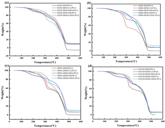 TGA curves of (a) D230 series coatings. (b) DMH series coatings. (c) TGA curve of IPDA series coatings. (d) PACM series coatings.