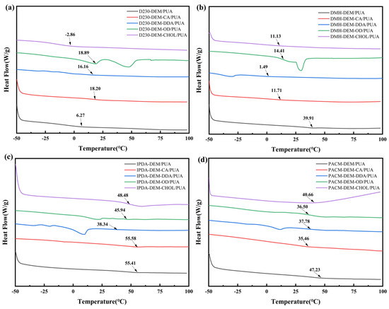 DSC curves of (a) D230 series coatings. (b) DMH series coatings. (c) IPDA series coatings. (d) PACM series coatings.