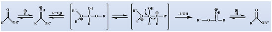 The mechanism of acid-catalyzed ester exchange reactions involves the activation of the ester carbonyl group by a protonic acid, which increases the electrophilicity of the carbonyl carbon. This activation allows the carbonyl carbon to be attacked by an alcohol, forming a tetrahedral transition state, which is followed by the elimination of an alcohol molecule and the proton, yielding the ester exchange product. The mechanism is depicted in Scheme 2.
