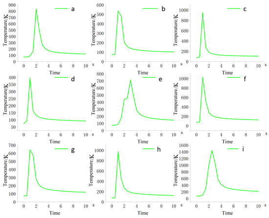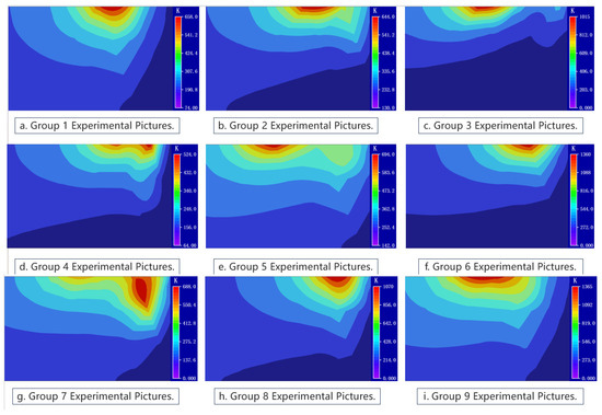 Figure 9a–i corresponds to experimental groups 1 to 9, respectively. From the simulated temperature field diagrams, the peak temperature of the weld and the corresponding molten pool morphology can be clearly observed.