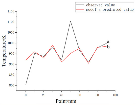 Figure 13 presents the temperature curves, comparing the observed and simulated values. Curve ‘a’ represents the observed values, while curve ‘b’ represents the model’s predicted values. By comparing these curves, we observe that, except for a few points, the temperature trends of the observed and predicted values align well, indicating a good agreement between the simulation and experimental results.