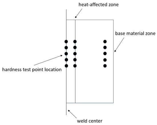 The hardness was tested at five points along the weld, with a spacing of 0.5 mm between adjacent points. A load of 1000 N was applied for 10 s.