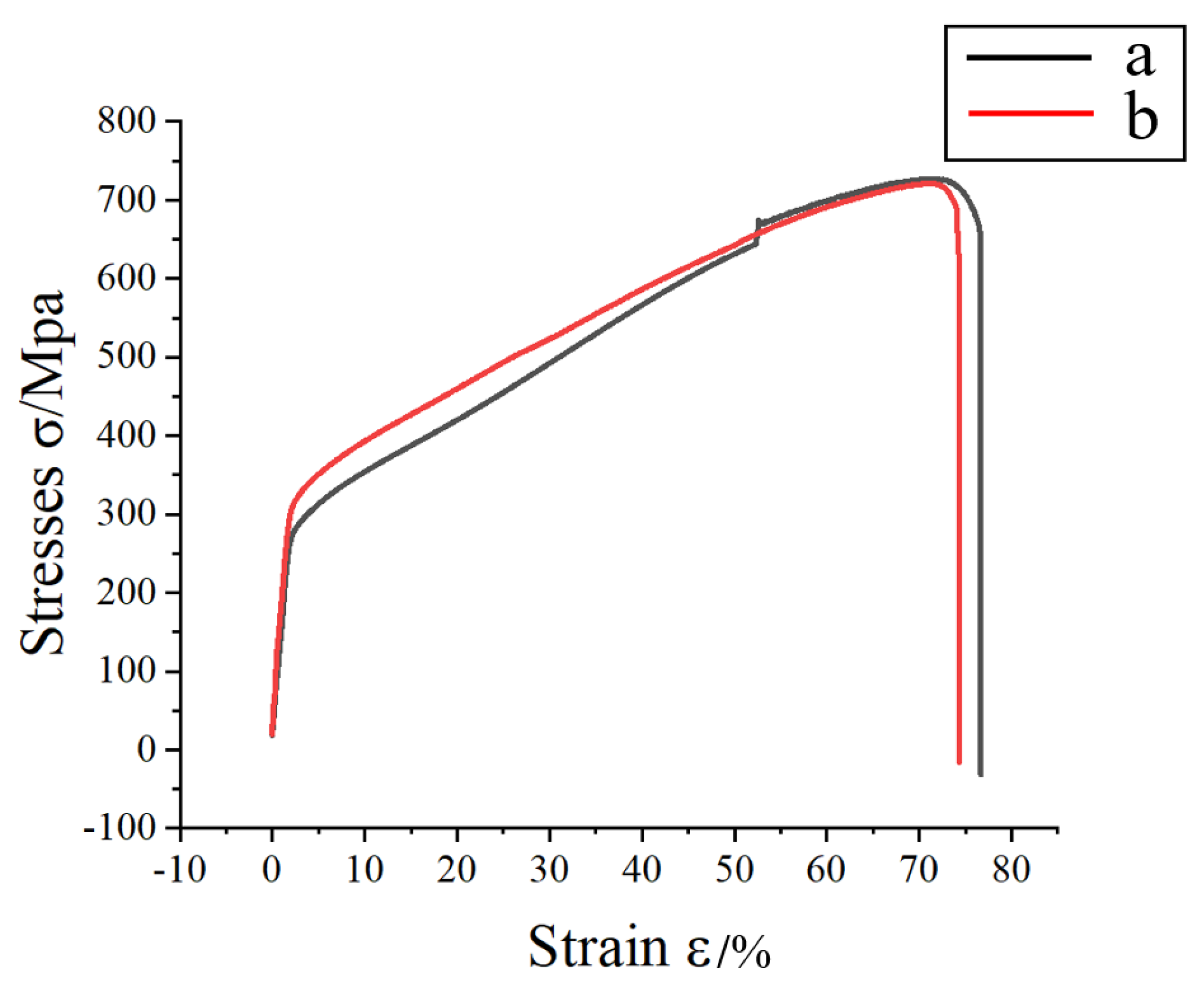 The strain range of the weld (a) is consistent with that of the base material and (b) exhibits a more prolonged plastic deformation phase under high-stress conditions. Notably, at a strain of 55%, the weld curve shows a brief stress spike (indicated by the arrow in