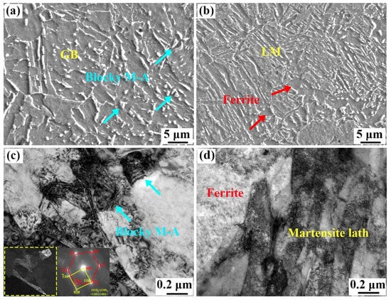 Figure 2 reveals the SEM and TEM images of the NZs at various cooling mediums. It can be found that the prior austenite grains (PAGs) were significantly refined under the external cooling medium. At air cooling, a coarse GB with blocky M-A constituents was detected in the NZ, while fine martensite with ferrite dispersion distribution was obtained in the NZ when the solid CO2 cooling was utilized. Previous studies indicated that bainitic ferrite preferentially nucleates at PAG boundaries with low C content, and C-rich austenite is formed with the growth of bainitic ferrite because C atoms in the bainitic ferrite are excluded [4,20]. During subsequent cooling, part of that austenite is transformed into martensite, i.e., the M-A constituent is formed. Therefore, at air cooling, the blocky M-A constituents were formed along the PAG boundaries and within GB. By contrast, a low peak temperature was obtained in the NZ under solid CO2 cooling, inhibiting PAG growth. Furthermore, a fast post-weld cooling rate is conducive to the occurrence of martensite transformation. As a result, fine martensite was discovered in the NZ under solid CO2 cooling. Furthermore, some ferrite was identified in the NZ because some ferrites did not austenize during FSW. Similarly, ferrite/martensite microstructures were observed in the NZ of FSW X80 owing to the application of liquid CO2.