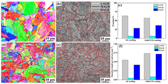 Inverse pole figures; boundary distribution maps of the NZ at air cooling (a,b), solid CO2 cooling (d,e), and corresponding statistics (c,f).
