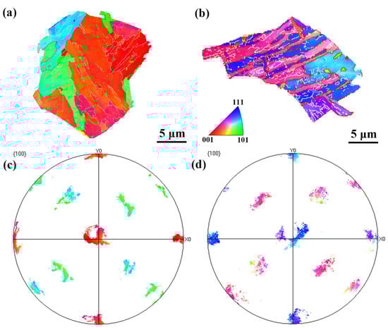 IPF and {100} pole figures in a single PAG at air cooling (a,c) and solid CO2 cooling (b,d).