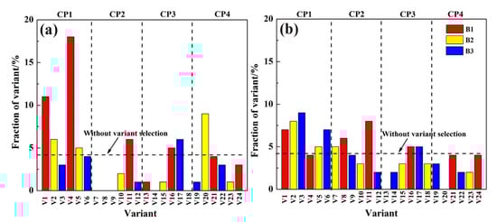 In fact, the generation of Bain or CP groups is closely related to variant selection. To clarify the effect of the cooling medium on variant selection, the variant fraction in the PAGs under air and solid CO2 cooling is calculated and shown in Figure 6. At air cooling, fewer variants were generated, and some variants account for a large proportion, indicating that serious variant selection occurred. At solid CO2 cooling, the variant variety increased, and the proportion of each variant did not change significantly, suggesting that the variant selection was inhibited. Wang et al. [21] pointed out that a high cooling rate can effectively inhibit variant selection in the fusion welding of low-carbon steel, facilitating the formation of the CP group. However, the low cooling rate promoted variant selection, resulting in the generation of Bain groups. Furthermore, our previous study found that the strong deformation of FSW created severe variant selection in the NZ of bainitic steel, forming the Bain group [4]. Therefore, under air cooling, the low cooling rate and intense deformation together promoted the variant selection, while the high cooling rate is the dominant factor in inhibiting the variant selection under solid CO2 cooling.