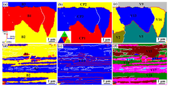 To further clarify the relationship between the variants and the Bain or CP groups, local crystallographic orientations in the PAG were observed, as shown in Figure 7. The HAGBs, MAGBs, and LAGBs were characterized by red, block, and white lines, respectively. The three Bain groups and four CP groups are represented by three colors (yellow, red, and blue), four colors (yellow, blue, red, green), and six colors (brown, blue, pink, ultramarine, dark green, and yellow), respectively. It can be found that a coarse bainitic block and fine martensitic block were detected in the CP group under air and solid CO2 cooling, respectively. Previous studies indicated that the Bain and CP groups correspond to the block and packet, respectively [24]. This result was consistent with the high fraction of HAGB generation in the NZ under solid CO2 cooling. Furthermore, Figure 7c,f reveals that the low-misorientation variant pairs (V13/V16 and V15/V18) were generated within blocks at various cooling conditions. Generally, the high cooling rate can effectively inhibit the generation of low-misorientation variant pairs. However, the ratio of low-misorientation variant pairs in the blocks under solid CO2 cooling increased significantly compared to that of air cooling. This may be attributed to the amounts of dislocations introduced during FSW because of strong plastic deformation, and the fast post-welding cooling rate inhibited dislocation recovery, facilitating the formation of low-misorientation variant pairs in the blocks.