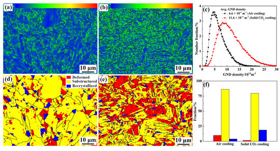 GND and recrystallization maps of the NZ at air cooling (a,d) and solid CO2 cooling (b,e); the corresponding statistics (c,f).