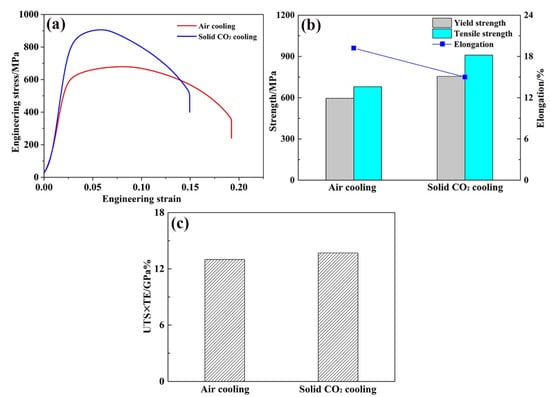 Engineering stress–strain curves (a), tensile properties map (b), and UTS × TE map (c) of the NZ at various cooling mediums.