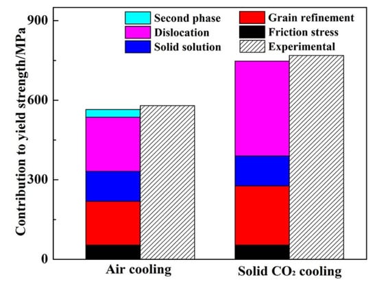Based on the above analysis, the contribution of various strengthening mechanisms to yield strength is summarized in Figure 10, and the yield strength measured by experiments is also added in the figure. It can be found that the experimentally measured values were basically consistent with those calculated by theory, and the significant increase in the yield strength of the NZ at solid CO2 cooling was mainly due to dislocation strengthening and grain-refinement strengthening. Apparently, the yield strength in the NZ of FSW X80 pipeline steel can be effectively improved by applying a cooling medium.