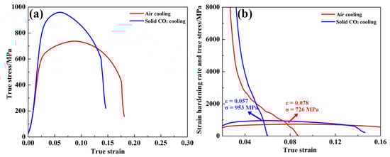 True stress (a) and SHR (b) vs. true strain curves of the NZ at different cooling mediums.