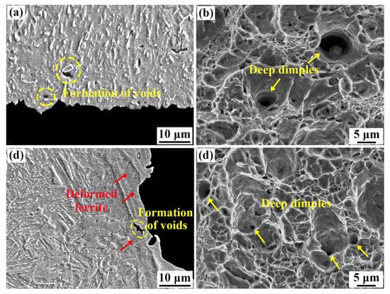 After necking, the stress state of the necking area changes from uniaxial to triaxial, which promotes the formation of voids due to the enhancement of stress concentration. As the strain increases, the voids undergo growth and coalescence, eventually leading to fracture. To elucidate the relationship between microstructure characteristics and fracture behavior, the tensile fracture characteristics in the NZ under different cooling mediums were observed, as shown in Figure 12. At air cooling, the voids were mainly generated near the M-A constituent, and the crack propagation path was straight. Furthermore, a small number of large and deep dimples were observed on the fractural surface, indicating that the crack needs to consume less energy during propagation. By contrast, the initiation of the voids was mainly at the interface between martensite and ferrite under solid CO2 cooling, and the crack propagation path was tortuous. In addition, a large number of small and deep dimples were dispersed on the fracture surface, suggesting that more energy was consumed during the propagation of cracks.