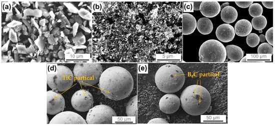 Figure 1 presents the morphologies of the three powder samples. B4C manifests a lamellar structure, with a size ranging approximately from 5 to 10 μm (Figure 1a). TiC has a relatively smaller particle size, measuring 200–300 nm (Figure 1b), while TC4 has a particle size of 100 μm (Figure 1c). Figure 1d,e display the morphologies of the ball-milled TiC/TC4 and B4C/TC4 composites, respectively. After refinement, the B4C and TiC powders exhibit reduced mobility and enhanced viscosity. This change enables them to bond more effectively with the TC4 particles. The substantial difference in particle sizes between B4C, TiC, and TC4 renders it extremely difficult to concurrently observe the microstructures of B4C and TiC together with TC4 at a single scale. Nevertheless, as is evident from Figure 1d,e, both B4C and TiC can uniformly adhere to the surface of TC4. Consequently, the spherical TC4 particles are evenly coated with a layer of either B4C or TiC.