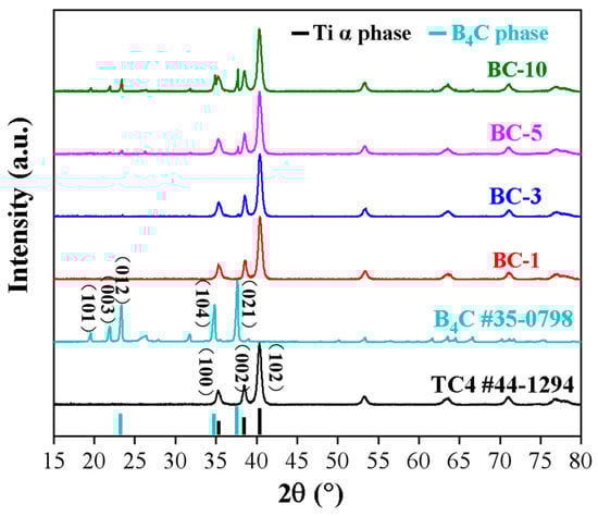Figure 2 shows the XRD spectra of the samples. As indicated, both the B4C and TC4 samples consist of pure powder. After mixing, the B4C/TC4 composite powder consists of the diffraction peaks of both B4C and TC4, and the intensity of B4C diffraction peaks increases as the content of B4C increases. Except for the diffraction peaks of TC4 and B4C, no other diffraction peaks are observed from BC-1 to BC-10, demonstrating the absence of impurity phases or new compound formation during the mixing process.