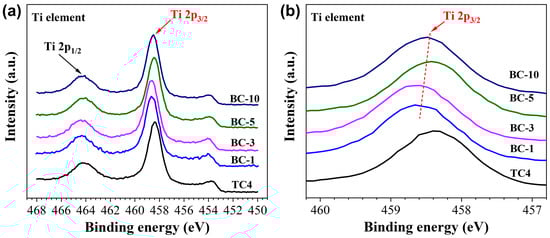 As the Ti 2p (TiO2 form, a form of annotation, the material does not contain TiO2) binding spectral line is the primary binding form of the Ti element in TC4, the distribution of the binding spectral line of Ti 2p3/2 (TiO2 form, hereinafter referred to as Ti 2p3/2) is detailed in Figure 3b. It can be observed that the binding energy corresponding to the Ti 2p3/2 spectral line in the pure TC4 sample is 458.3 eV. When the content of B4C and TC4 is lower than 1:30 (i.e., BC-1 and BC-3), the binding energy of the Ti 2p3/2 spectral line increases with the increase in B4C content. Specifically, the binding energy of the Ti 2p3/2 spectral line of BC-1 is 458.6 eV, and that of BC-3 is 458.7 eV. However, with the further increase in B4C content, the binding energy corresponding to the Ti 2p3/2 spectral line begins to decline. The corresponding binding energy of the Ti 2p3/2 of BC-5 and BC-10 is 458.4 eV and 458.5 eV, respectively. With the increase in the content of B4C, the electron binding energy is shifted towards an increase in binding energy. The numerical changes show that when B4C powder is added, even if there is no change in lattice structure, B4C can still have a certain effect on the electrons around Ti atoms in TC4. Combined with the results of Figure 1, B4C is a lamellar structure, and its own structure also leads to the uneven distribution of electron clouds around B atoms and C atoms, i.e., the phenomenon of polarization exists. When the ratio of the two is lower than 1:30, a small amount of layered and polarized B4C can attract electrons around Ti atoms, which increases the average electron potential energy in some parts of TC4. This results in the electronegativity of Ti 2p electrons further increasing and the electron cloud density around some Ti atoms further decreases. As a result, the binding energy increases, and the initial kinetic energy obtained by electrons decreases [10]. However, when the content of B4C is further increased, the distribution of B4C becomes more uniform, leading to a decline in the ability to induce the electron cloud migration of Ti atoms in TC4. Therefore, for elemental Ti, its own oxidation ability is weakened and the electron cloud distribution is nearly uniform.