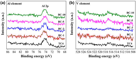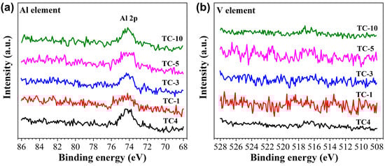 Since Al and V in TC4 are solidly dissolved in the Ti matrix as intermediate phases of Al-V alloys, the XPS peak intensities for both Al and V are weak. Figure 4a,b show the binding spectra of Al and V, respectively [11], with no distinct binding peak observed due to the low V content. According to Figure 4a, there are only two forms of binding energy for Al at ~74.2 eV. Therefore, it can be inferred that the electron cloud around Al is not changed by the doping of B4C. In addition, due to the low intensity of the Al2p3/2 spectral line, no electron binding spectral line of Al2p1/2 is observed.