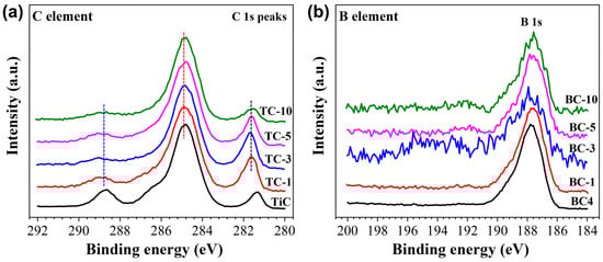 The binding energy spectral lines of elements C and B in B4C are shown in Figure 5. In Figure 5a, it can be observed that the electron spectral lines of C1s in elemental C have the highest intensity at 285.1 eV, where there is a chemical shift towards an increase in binding energy between samples BC-1 and BC-3. This indicates that in the BC-1 and BC-3 samples, there is an increase in the positive ion energy around the C atom, resulting in stronger electron binding. Additionally, the electron spectral lines of C1s of BC-1 and BC-3 exhibit an asymmetric trend, which also suggests that the incorporation of a small amount of B4C into TC4 leads to a tendency for the electrons around the C atom to transition into metallized electrons, thereby enhancing the electronegativity of the electrons surrounding the C atom. However, with a further increase in the B4C content, the C1s line of the C atom returns to 281.5 eV. This suggests that the increased B4C in the BC-5 and BC-10 samples makes the distribution of B4C in TC4 more uniform, thus weakening the electronegativity of electrons surrounding the C atom. In addition, for the C atom in B4C, there are still C1s electron spectral lines at 281.7 eV and 288.9–289.5 eV, which means that there are two other electron ground-state binding forms between the B and C atom. At 281.7 eV, the intensity of the C1s binding spectral line in B4C is the highest, and with the increase in B4C content, the intensity of the C1s spectral line decreases. A similar phenomenon can be observed at 288.9–289.5 eV. This indicates that when the C atom in B4C is mixed with TC4, the increase in its proportion will decrease the electron state density between the B and C atoms. This means that the electron segregation will occur, which will have a greater impact on the electronic polarization of B4C. For atom B, as shown in Figure 5b, no significant difference is found in the value and intensity of its electron binding energy. Therefore, for the mixing of B4C and TC4, only the distribution of electron clouds around atom C changes greatly.
