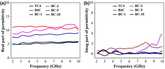 Dielectric properties of different B4C/TC4 samples at frequencies of 2~10 GHz. (a) Real part; (b) imaginary part.