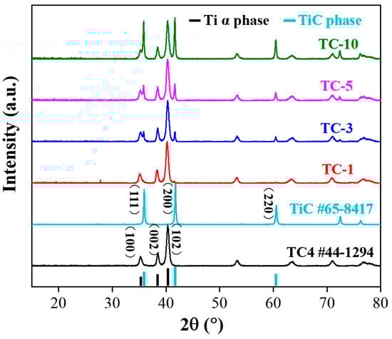 Figure 7 shows the XRD patterns of TiC and TC4 at different ratios. According to the PDF cards, the results are consistent with the B4C mixing results. TiC and TC4 are pure sample powders, and after mixing, as the content of TiC increases, the diffraction peak intensity of TiC in the samples also gradually increases. Additionally, except for the diffraction peaks of TC4 and TiC, no other diffraction peaks were observed in TC-1–TC-10. This also demonstrates that there is no lattice translation or other components in the TiC/TC4 mixing process.
