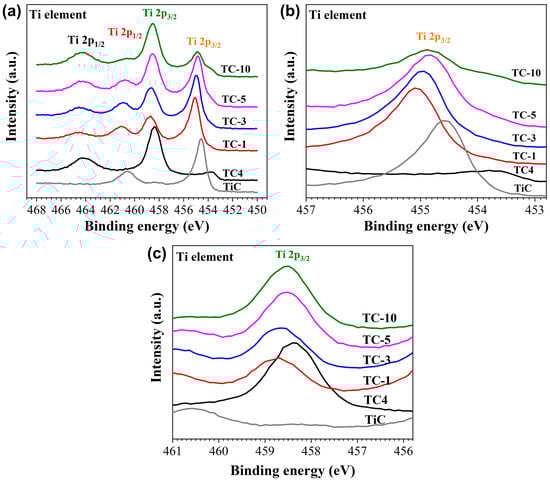 The XPS spectral lines of Ti atoms with different TiC contents are shown in Figure 8a–c. From the total XPS spectrum of Ti in Figure 8a, it can be seen that a group of binding spectral lines of Ti 2p3/2 appear at 454.9 eV. After a comparison with the results in Figure 2, it can be concluded that the binding spectral line here is the Ti element in TiC. Figure 8b shows the enlarged figure of the spectral line. When a small amount of TiC was incorporated into TC4 (TC-1 sample), the strength of the binding spectral line of Ti 2p3/2 (TiC class) decreased, which was consistent with the result of doping B4C. With the addition of TiC, the binding energy of Ti 2p3/2 (TiC form) also showed a chemical shift, increasing by 0.5–0.7 eV. The binding energy value of the Ti 2p3/2 (TiC form) spectral line of the TC-1 sample was the highest, at 455.2 eV. With the further increase in TiC content (TC-3 sample), the binding energy value of Ti 2p3/2 (TiC form) starts to decline, and for the TC-10 sample, not only does the binding energy value of the Ti 2p3/2 (TiC form) spectral line decrease to the lowest compared to TC-1–TC-10, but its strength also significantly decreases. This shows that in TiC, not only does the positive ion energy of the Ti atom begin to decrease, but also the two different forms of Ti atom electrons interact with each other, resulting in a decrease in its own electron state density. In addition, compared with B4C, the electron offset rate near the Ti atom in TiC is higher than that of the Ti atom in TC4, due to the better conductivity of TiC. However, when the TiC content is low, from a macro point of view, although the electron mobility is better than that of TC4 itself, it is weaker than that of TiC. Therefore, in TiC, the Ti atom’s electron binding ability is also between that of TC4 and TiC. Consequently, when a small amount of TiC is mixed into TC4, the electronegativity of the Ti atom will increase.